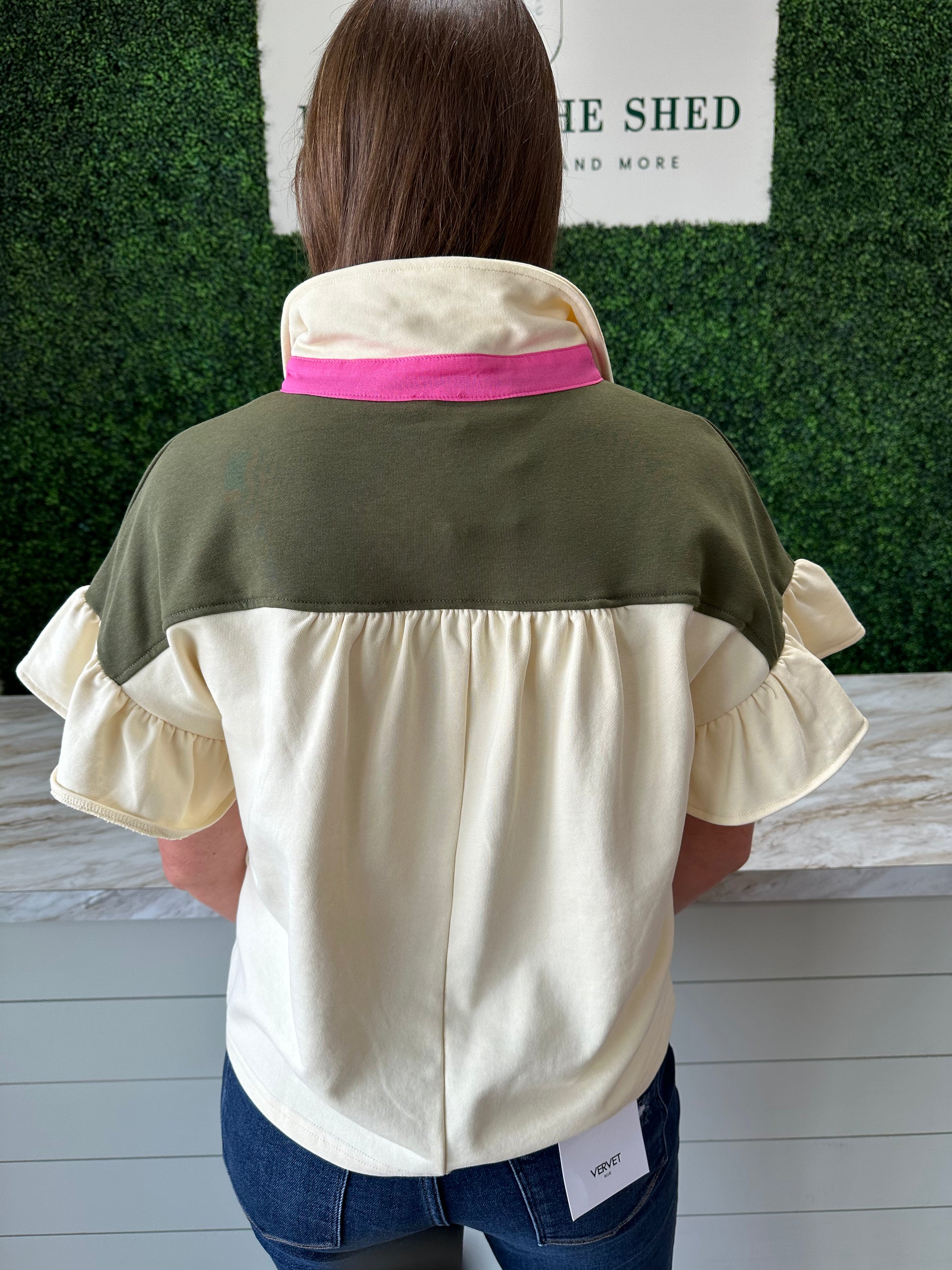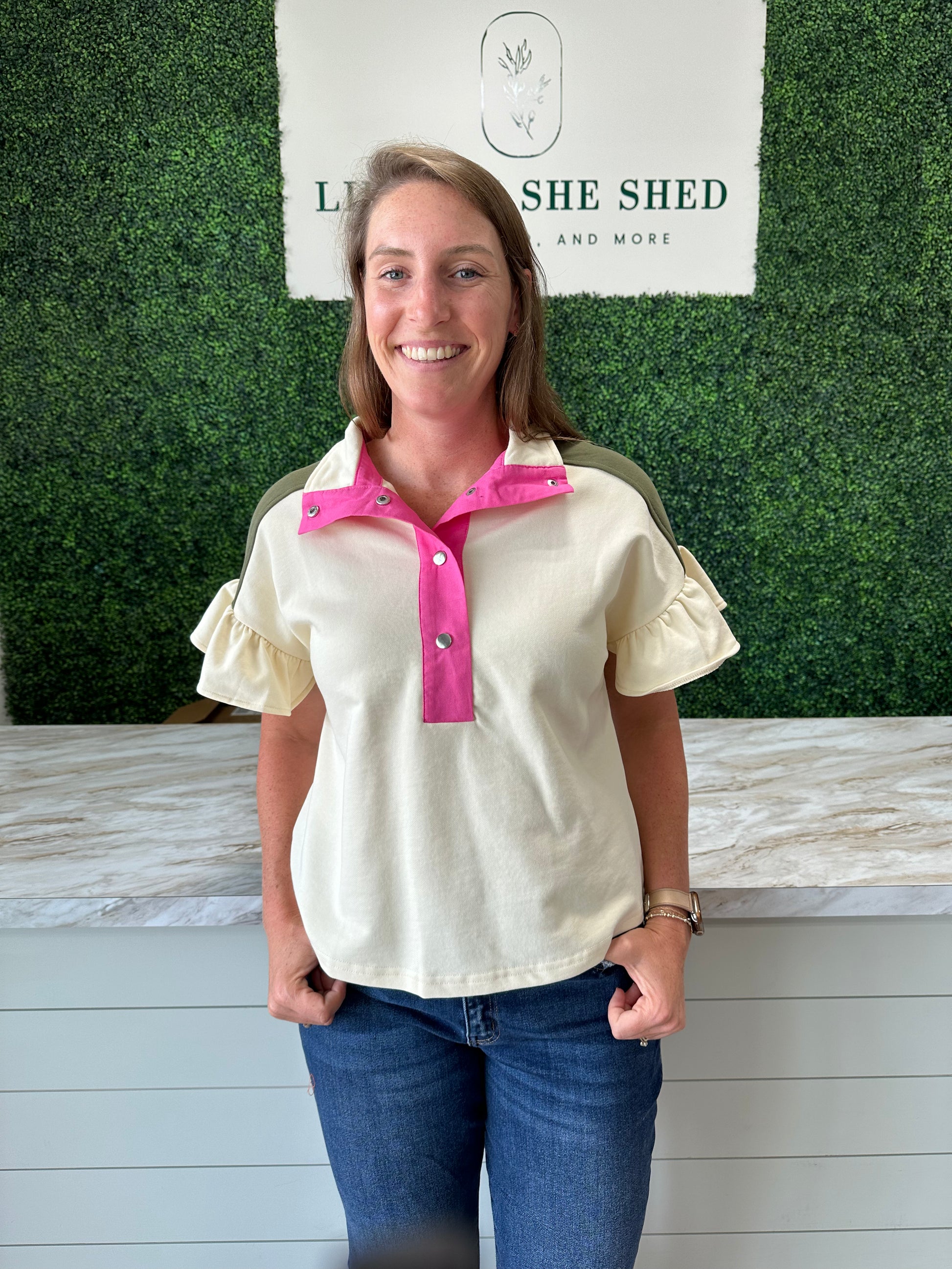 The ruffle sleeves and eye-catching color block design will make you stand out in any crowd. Plus, the button detail adds a unique and stylish touch. Elevate your everyday look with this must-have top!