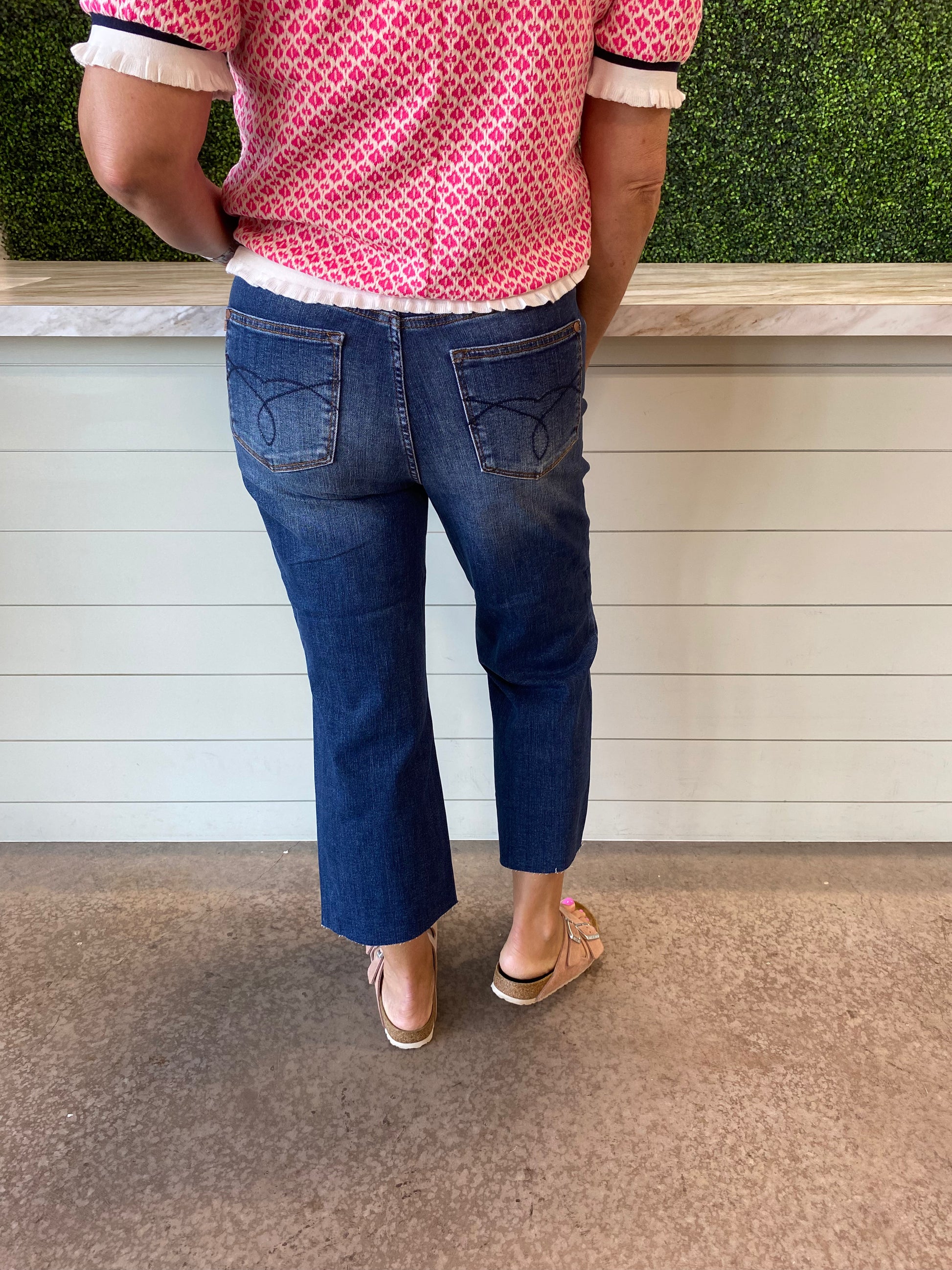 Dare to be different in our playful crop, wide-leg jeans. With a dark wash and crop cut, these wide leg jeans offer a unique twist on traditional denim. Perfect for standing out and rocking your own style.