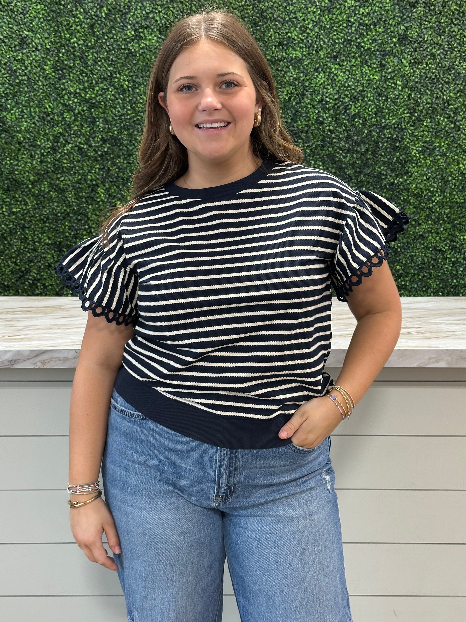 Striped Crew Neck Lace Trim Top