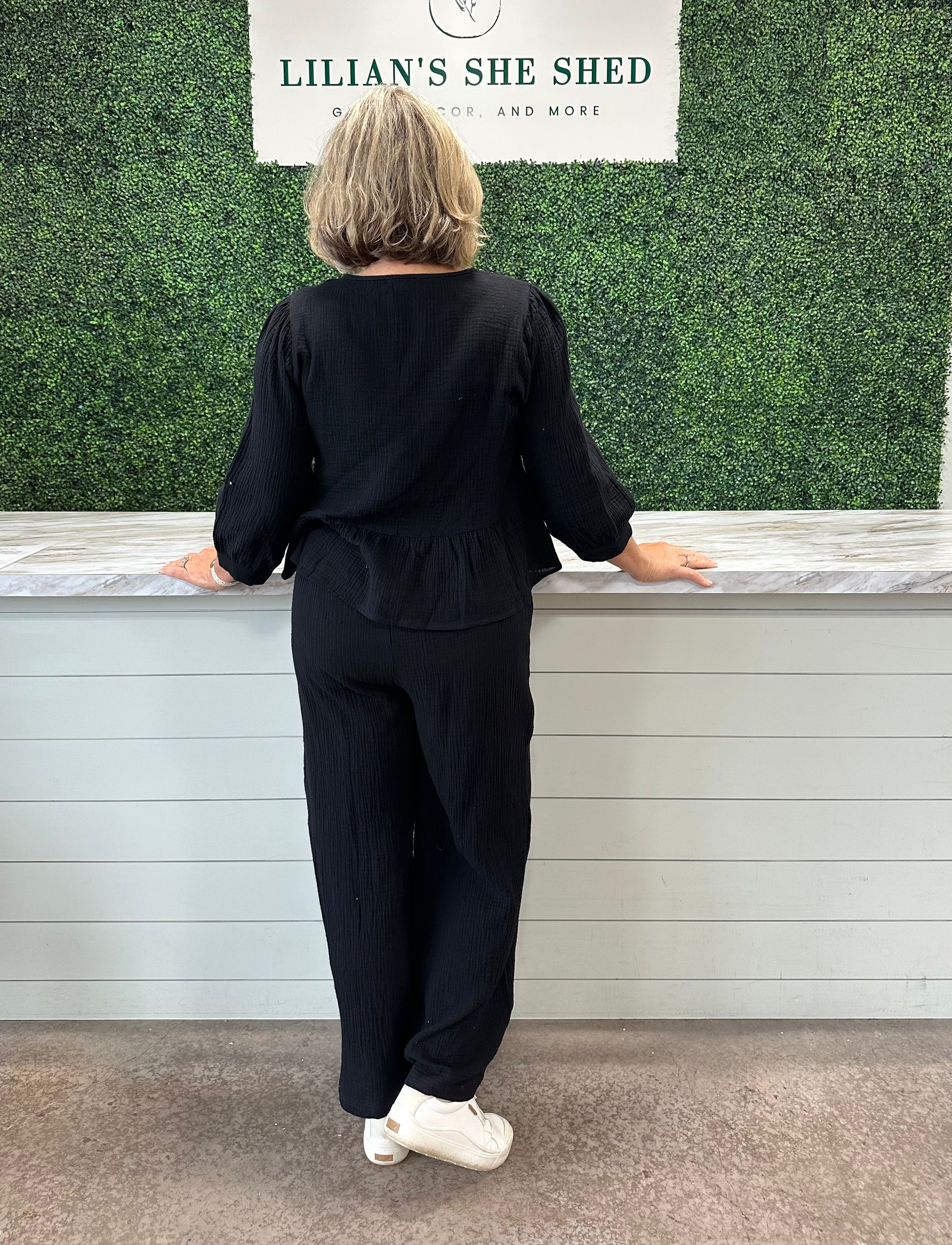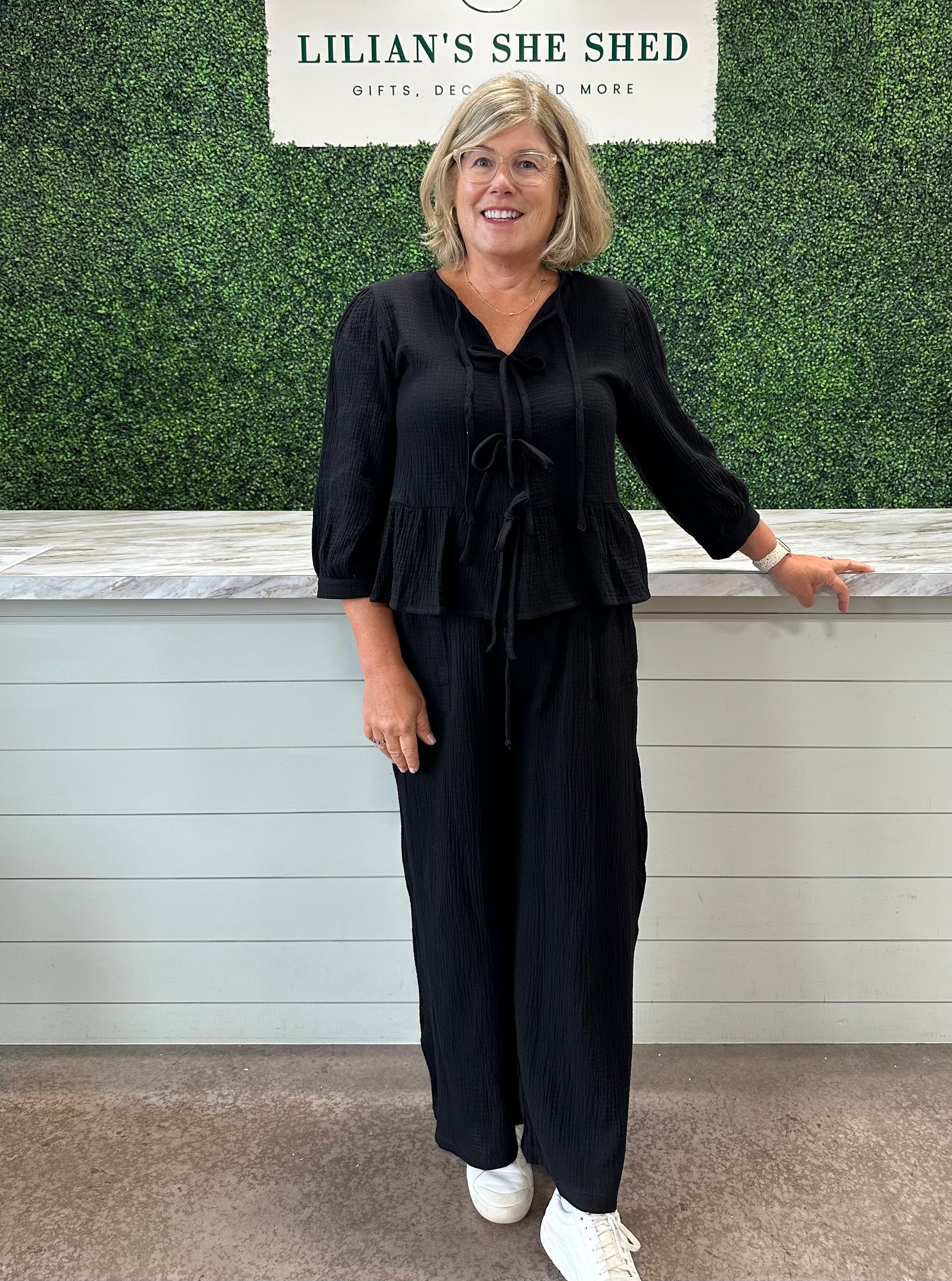 This playful black linen set features breezy pants paired with a quarter-sleeve top adorned with charming bows down the front. Perfect for adding a touch of fun and elegance to your casual wardrobe.