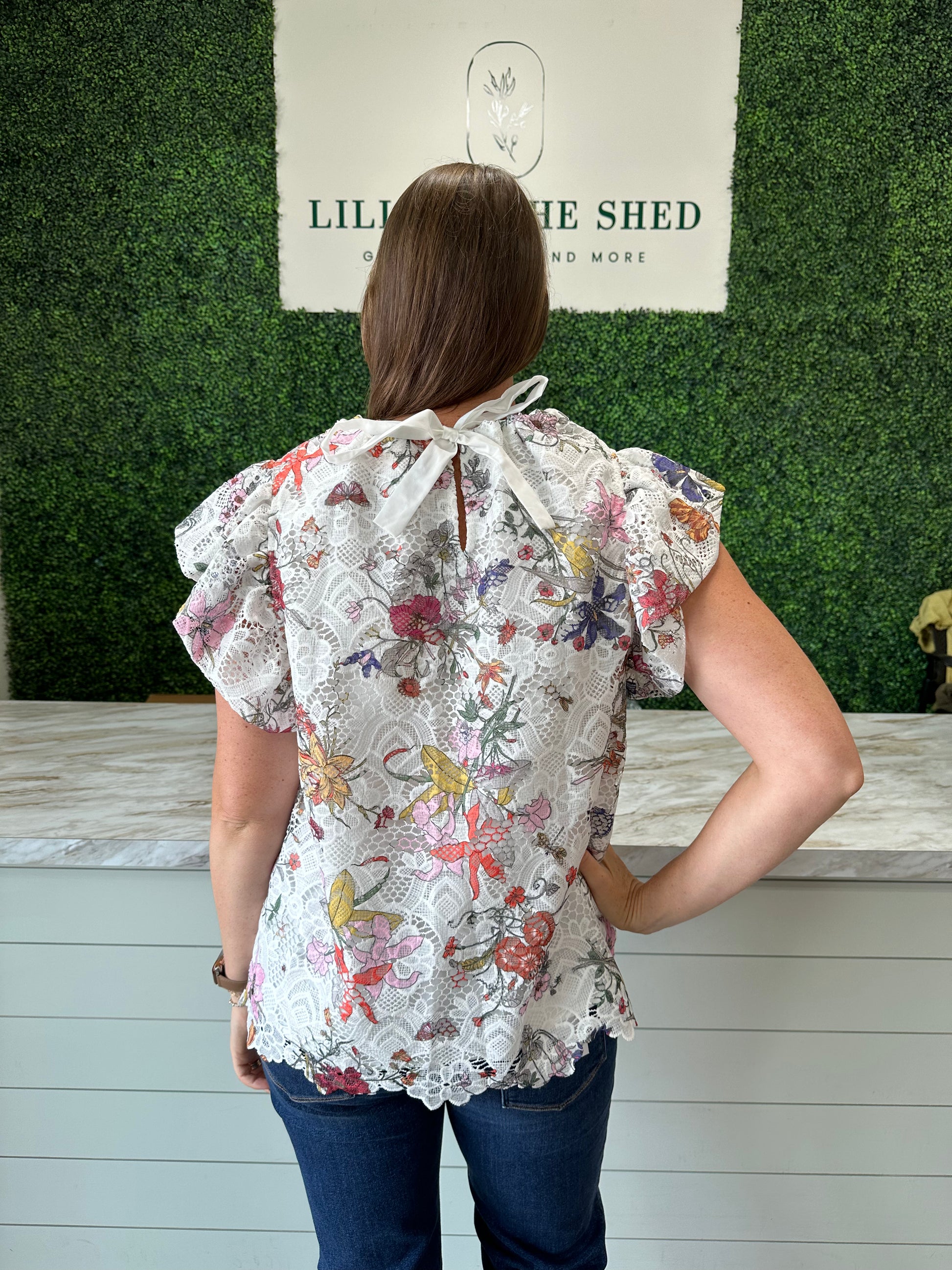 The intricate lace details and elegant floral design add a touch of sophistication to any outfit. Plus, the adjustable tie neck allows for a customizable fit. Look and feel confident in this must-have piece.